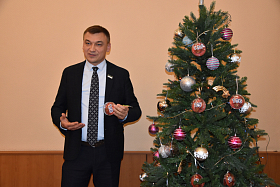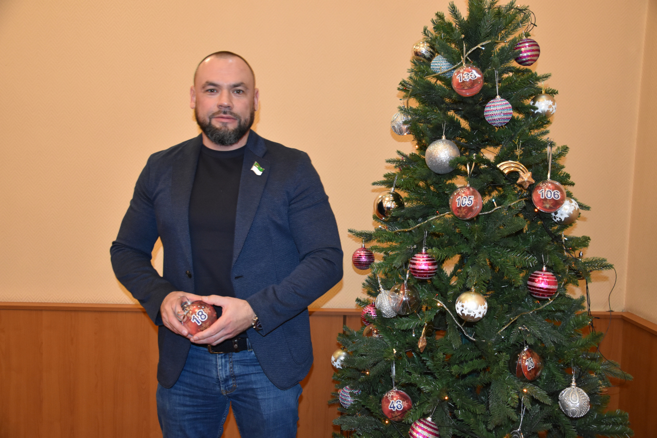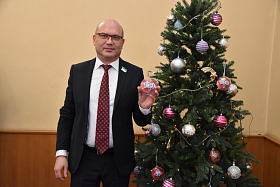 Первый шар с елки снял Председатель городской Думы Игорь Прозоров. Он исполнит желание Сережи из города Кургана, ему 13 лет и он мечтает о проводной клавиатуре.