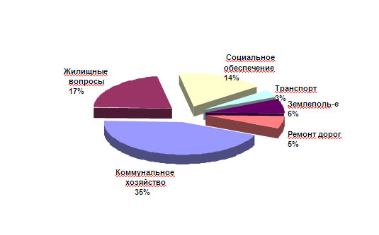 Анализ почты показал, что наибольшее количество обращений поступило по вопросам коммунального хозяйства – 318 (35%) обращений, из них по вопросам эксплуатация и содержание жилого фонда – 64; благоустройство территорий – 35; теплоснабжение -30; водоснабжение – 20; ликвидация свалок - 15; затопление подвалов жилых домов – 24, тарифы – 15.