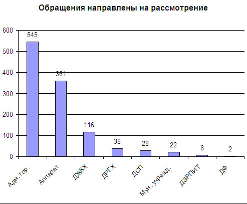 Из 1120 обращений – 361 (32%) рассмотрено депутатами городской Думы и специалистами аппарата Главы города и Курганской городской Думы. В соответствии с Федеральным законом от 02.05.2006 г. № 59-ФЗ «О порядке рассмотрения обращений граждан в Российской Федерации» и в связи с разделением полномочий 545 (49%) обращений направлены на рассмотрение в Администрацию города Кургана, 17% обращений направлены в Департаменты Администрации города, 2% обращений направлены в муниципальные учреждения (диаграмма 2).